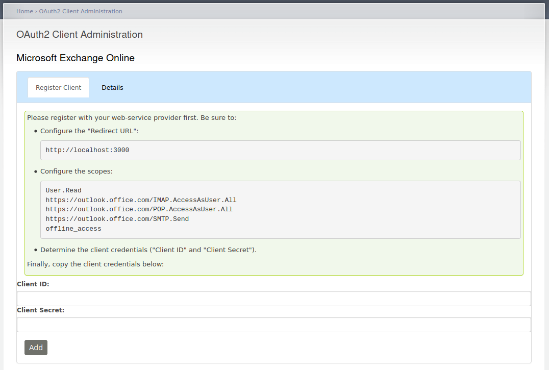 After registering OAuth2 details with CiviCRM and Microsoft, you can add an incoming email account.