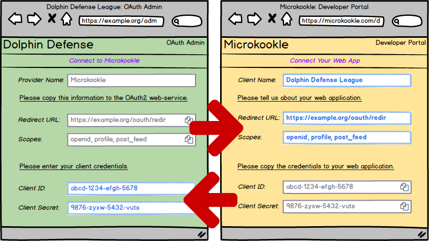 These variables will need to be matched-up. Both the Dolphin site and Microkookle site have OAuth administration pages, and the goal is to copy values between them. Blue fields indicate where you will typically enter information: