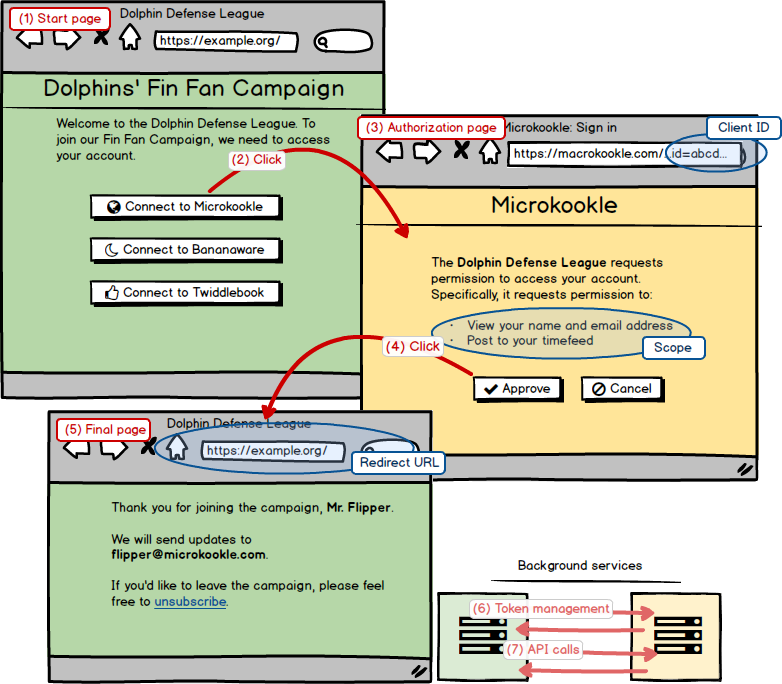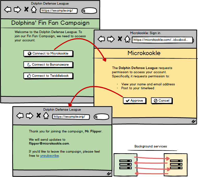 In the above example, one visits the website of a small organization, the Dolphin Defense League (green), which acts as the OAuth2 client. It directs the user to a large technology company, Microkookle (yellow), which acts as the OAuth2 provider.