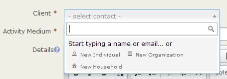 - Fill out the activity form. The Client field will be pre-populated with the case's client data.